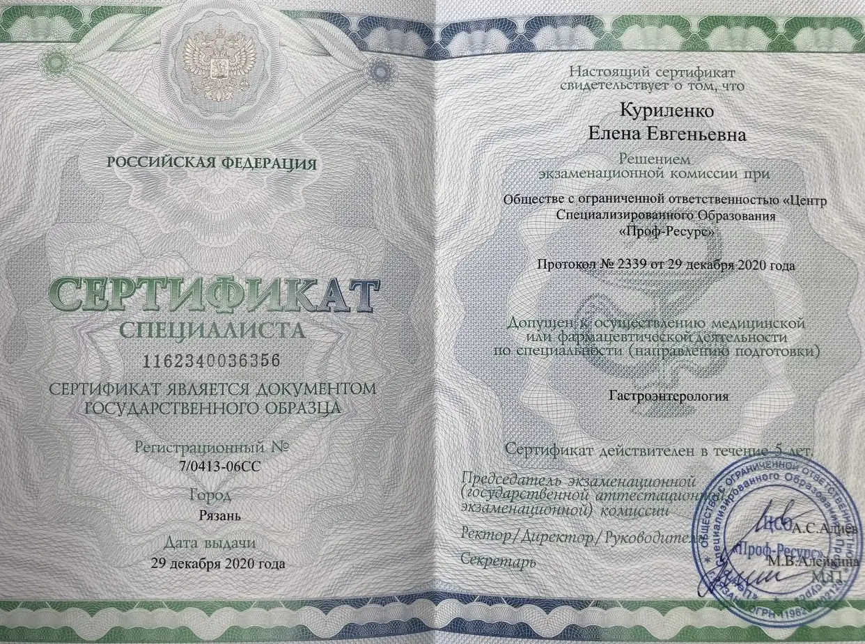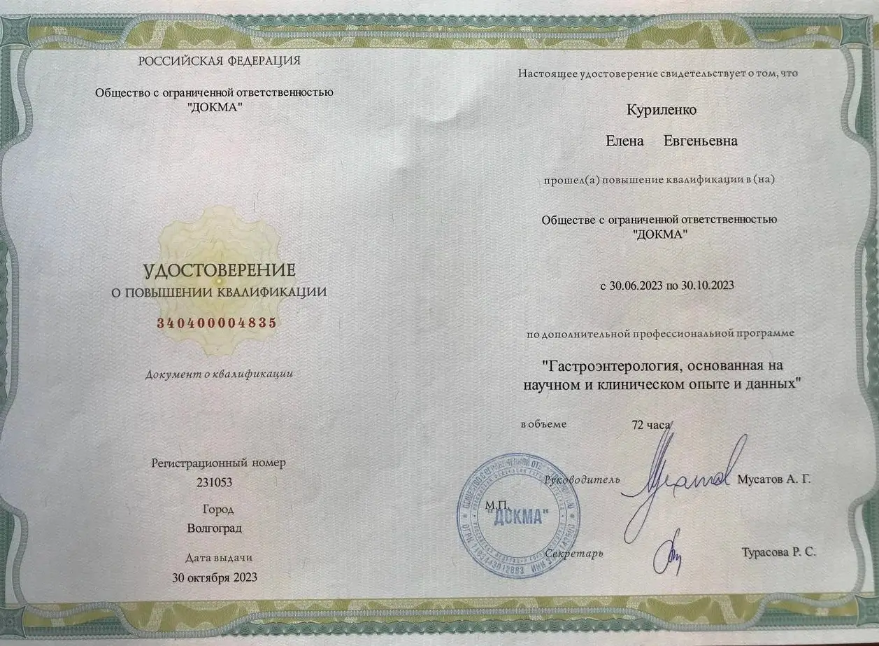 2008 г. – Ростовский государственный медицинский университет (гастроэнтерология)